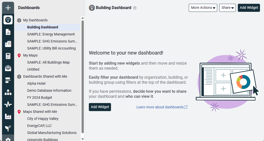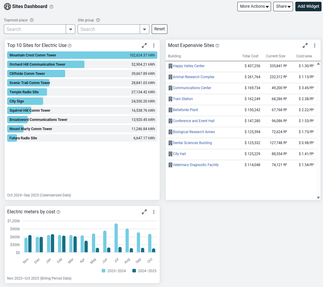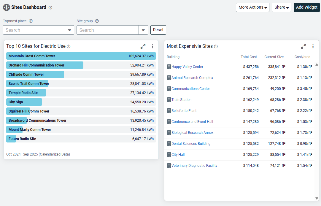 - There are many widgets available to add to a dashboard. For this example lets narrow our search to widgets that show site information. For the Object quick filter at the top, select Sites.