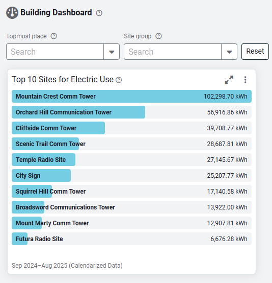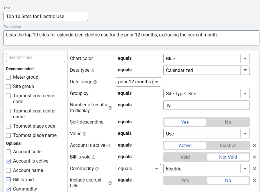 - Enter a description - "Lists the top 10 sites for calendarized electric use for the prior 12 months, excluding the current month".