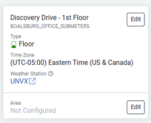 Spaces now display the associated weather station on the properties card. Weather stations are inherited from the site. Meters under spaces also display their weather station.