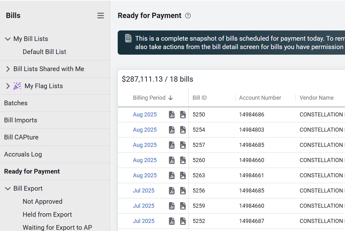 The Ready for Payment list is a unified, read-only view showing all bills scheduled to go out for payment that day. The list is designed to prevent mistakes by removing filters and ensuring everyone see the same list of bills.