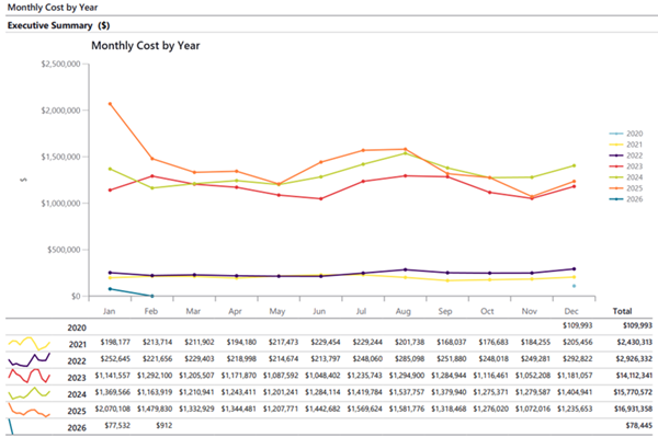 | Calendarized | Month-to-month or year-over-year cost analysis | Spreads each bill across true calendar months so totals line up with financial periods |