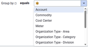 - Group by—Without this filter, Report-01 is a one-page summary report showing the total for the organization or topmost selected. The Group by filter can be: account, commodity, cost center, meter, organization types, site types, sites, vendors.