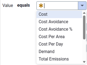- Value—Possible values include: Cost, Cost Avoidance, Cost Avoidance %, Cost Per Area, Cost Per Day, Demand, Total Emissions, Unit Cost, Use, Use Avoidance, Use Avoidance %, Use Per Area, Use Per Day.