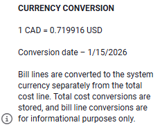 - The bill entry or edit date is used for the conversion factor.